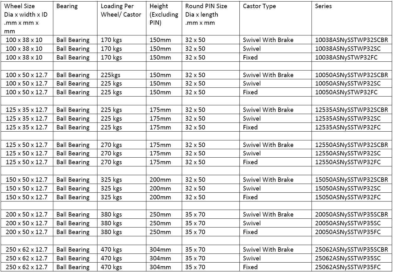 SOLID Round Pin type Castors (Brakes will be of Stainless Steel Shell with White NYLON Foot Pedal for Lock/ Unlock)